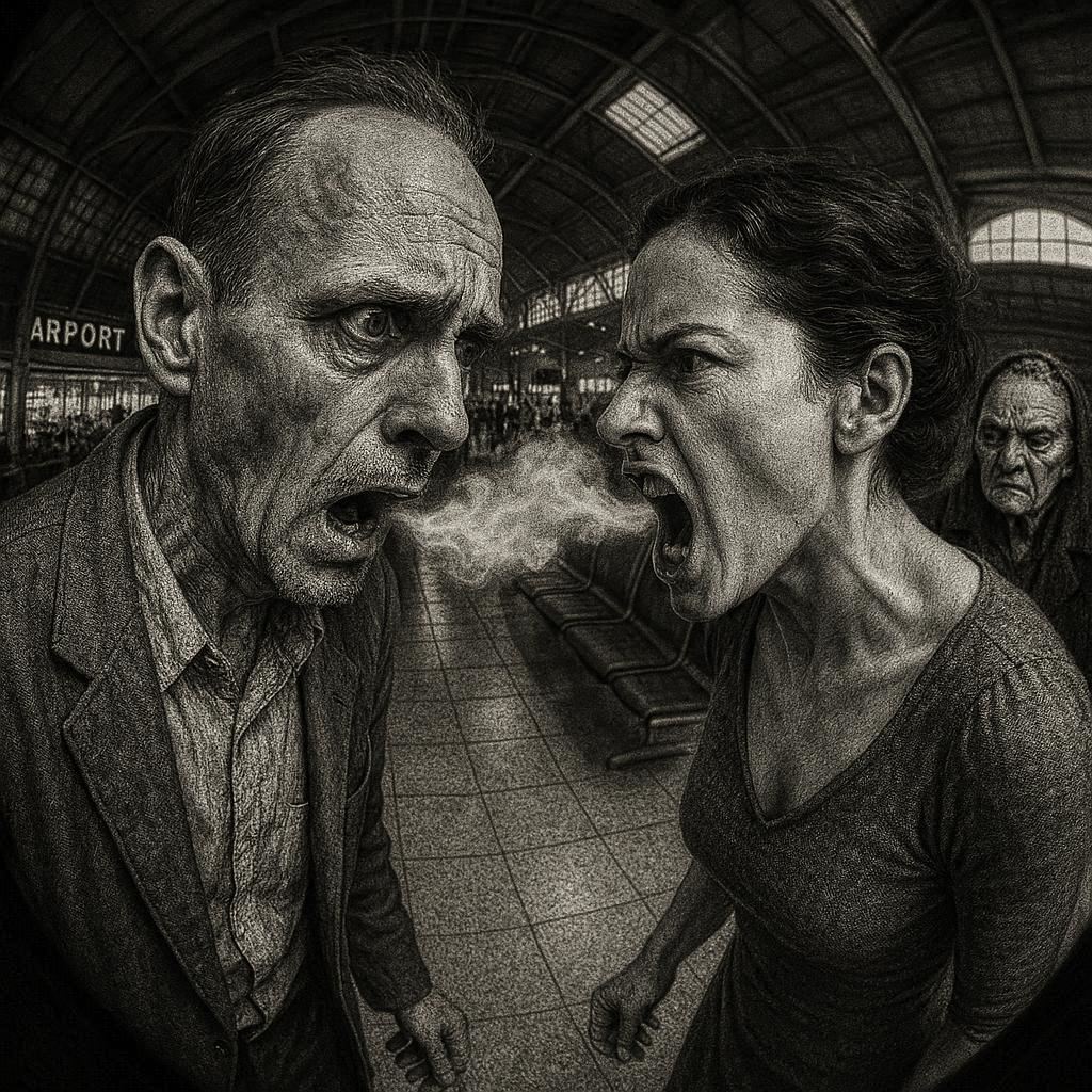 – Kan du ikke bare høre!!! freser hun. Det går ikke tog. Hun har sjekket alt, sier hun, og ja, kjempebra jobbet, men hadde det ikke vært for meg ville det ikke blitt noe tur, for hun holdt på å reise uten passene. Merkelig hvor lite det skal til før magen reagerer, kjenner mellomgulvet helt inn til ryggsøylen – varm i ansiktet, svetten gnager seg ut av pannen, armhulen, ryggen, det prikker og klør, jeg MÅ skrike for ikke å bli kvalt, jeg freser, jeg roper, men det høres puslete ut:
